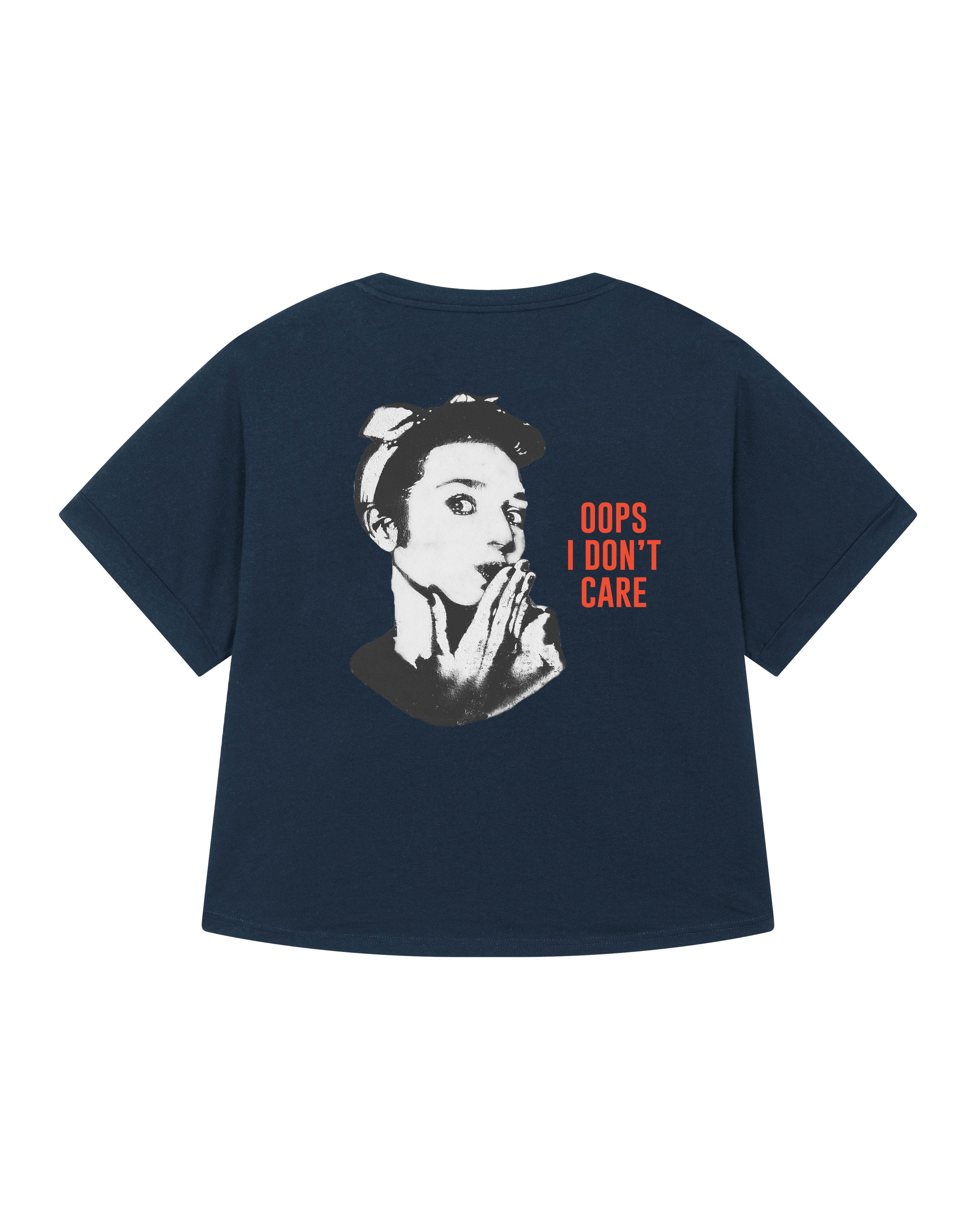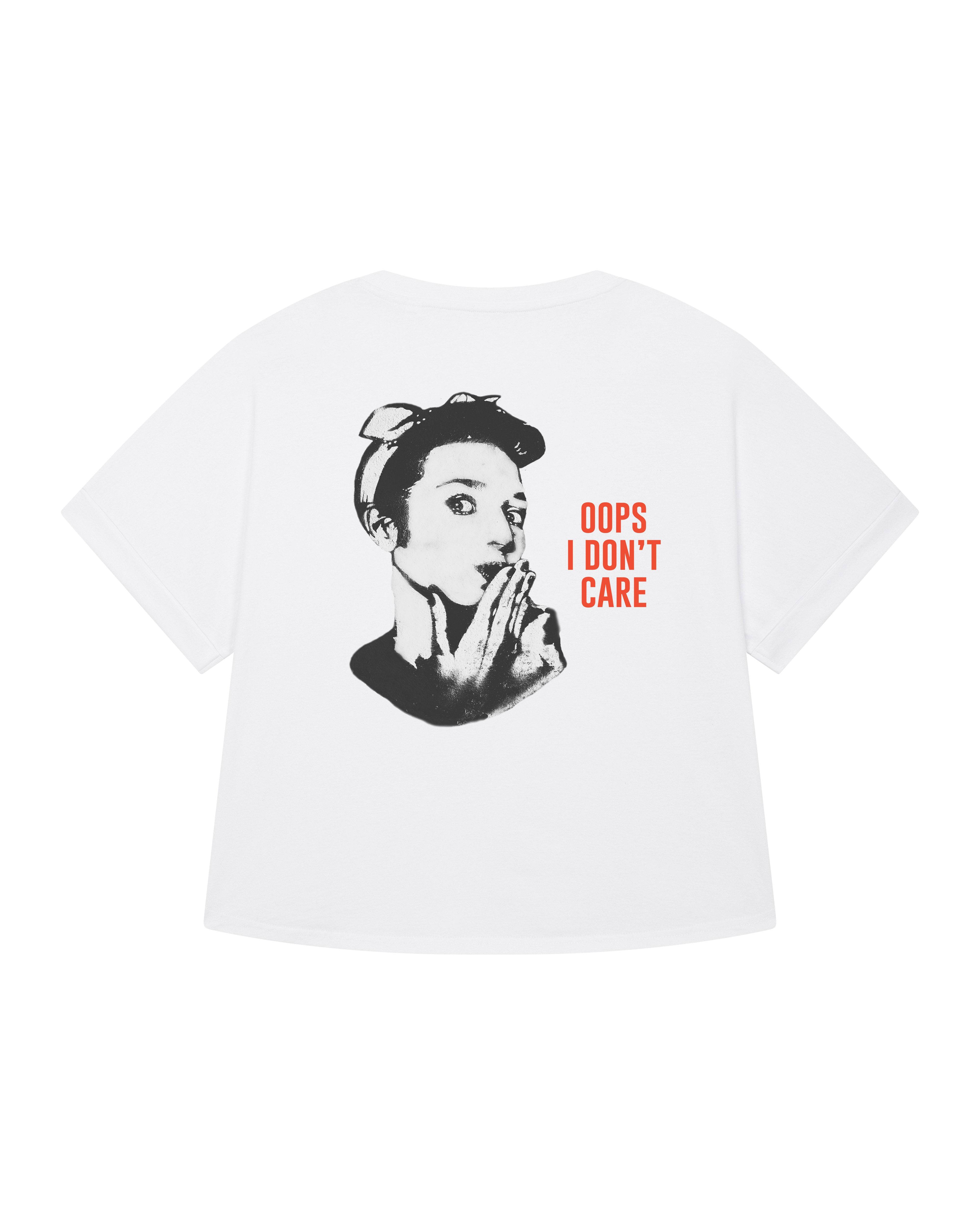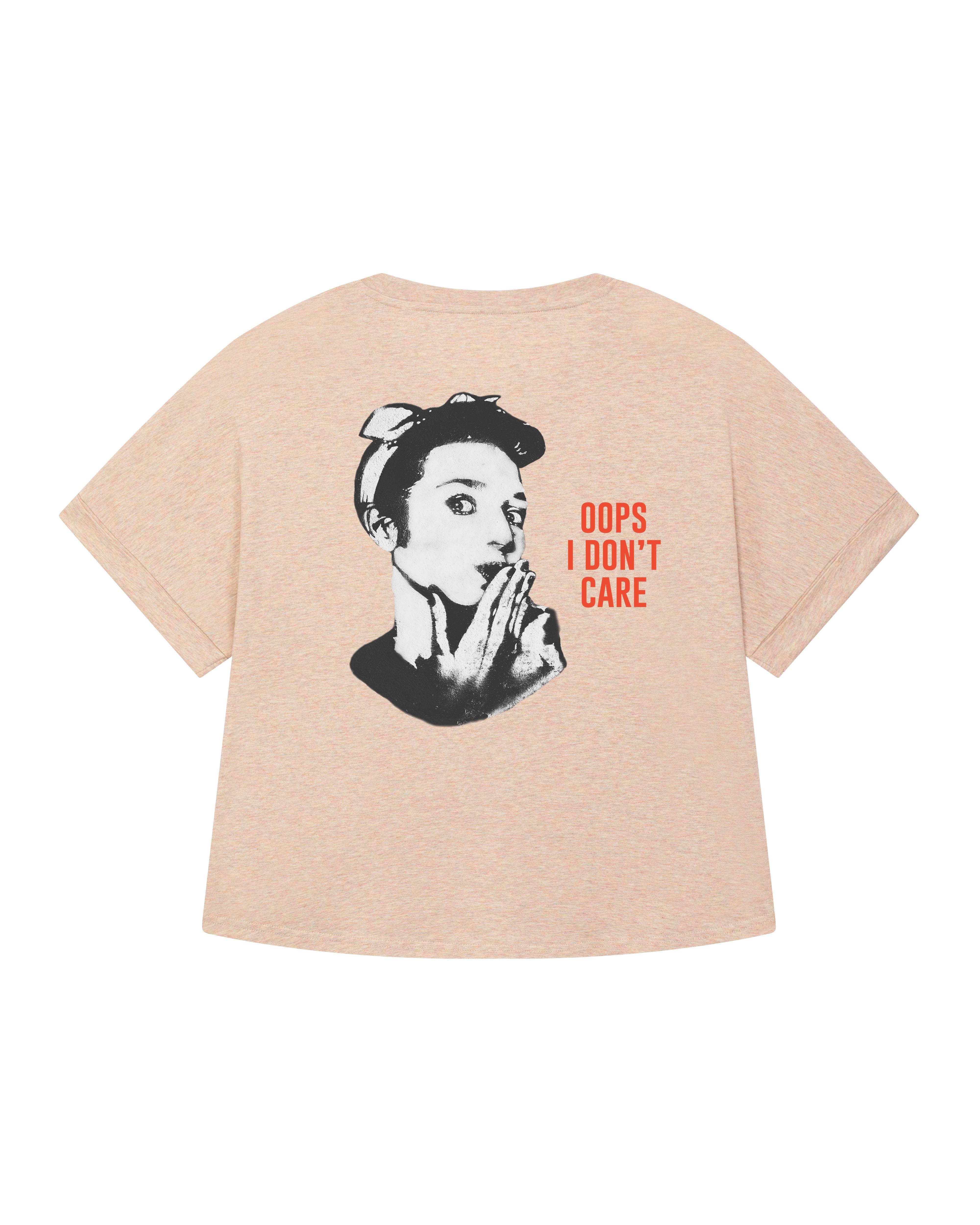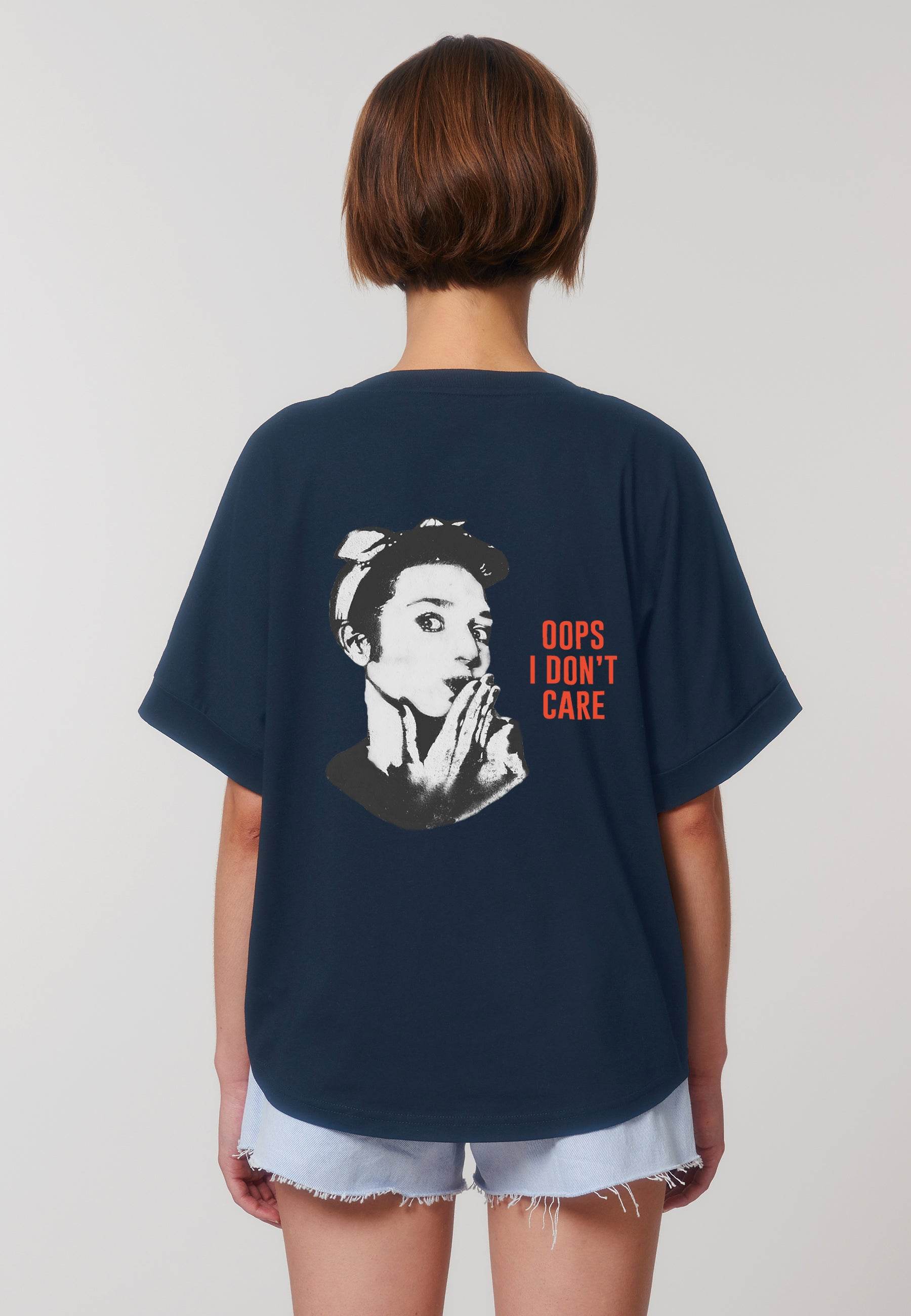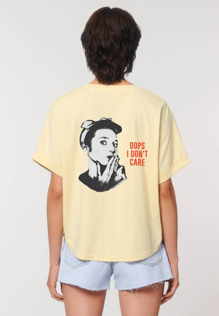 T-shirt Femme Manches Roulottées Imprimé au Dos "Oops I Don't Care"